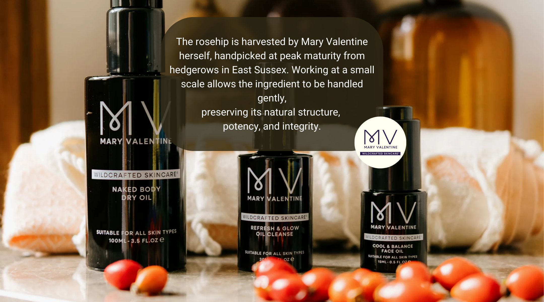 At the heart of the brand’s expertise are wild botanicals sourced by Mary Valentine herself. Ingredients such as wild rosehip are harvested at peak maturity from trusted local partners in East Sussex, ensuring their natural fatty acid profiles remain intact. Every ingredient serves a defined function, with nothing superfluous added.